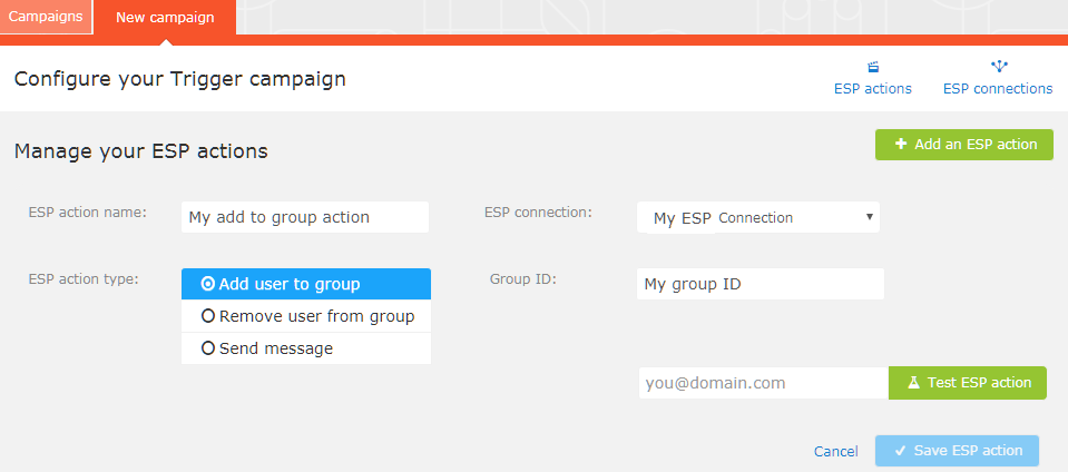 - Wählen Sie Ihren bevorzugten ESP-Aktionstyp aus den verfügbaren Optionen und geben Sie die benötigten Details ein (z. B. Gruppen-ID, Listen-ID, Nachrichten-ID, Datenbank); die Werte finden Sie in Ihrem ESP-Portal.