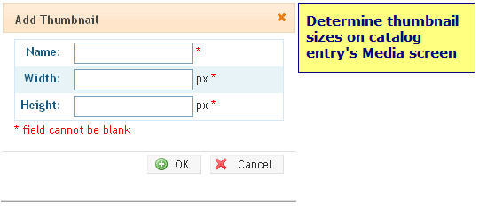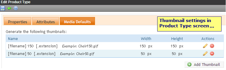 When you create a catalog entry, you base it on a Product Type. The selected product type’s Media Defaults information determines the sizes of thumbnails created for each image assigned to the Media tab. See Also: Media Defaults Tab4