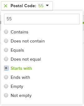 Some filter options require additional text input; for example, the Customer section's Postal Code option.