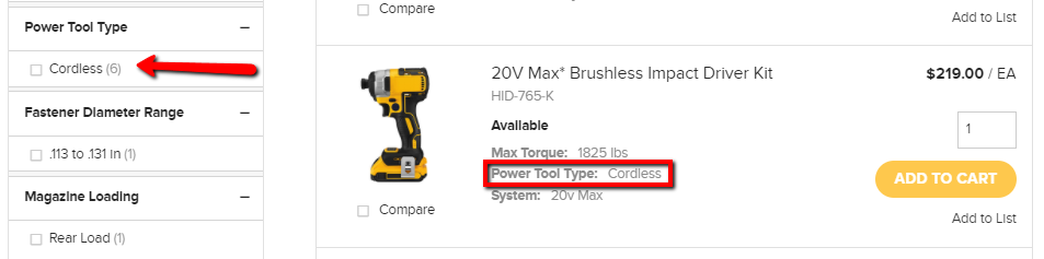 Hero Tools sells several power tools with long, specific names, like 20V Max* Brushless Impact Driver Kit. This product, HID-765-K, is also cordless, but Markus does not want to add an additional word to the product's title. He chooses to create an attribute called Power Tool Type (assigned to the Impact Drivers category), and an attribute value of Cordless (assigned to the product). After rebuilding the index, Markus searches for "cordless" on the website, and HID-765-K appears alongside other cordless products in the search results. Markus can even select the "Cordless" option on the left side of the screen to narrow his search results even further.