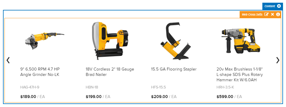 Elizabeth is looking for a way to increase sales of nails, staples, and other tool accessories/parts when site visitors purchase a power tool. She decides to add Product Cross Sells to HBN-18, Hero's best-selling cordless brad nailer, as a test. In the Admin Console, Elizabeth adds the matching nails, replacement charger, and replacement battery pack to HBN-18's Cross Sells finger tab in the Admin Console. After some user testing, Elizabeth decides to add Cross Sells to all of Hero's power tools products. She accomplishes this by using product import (see below).