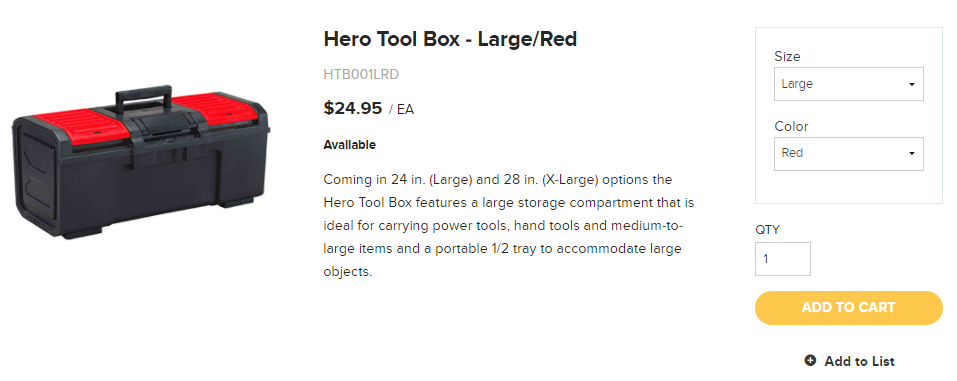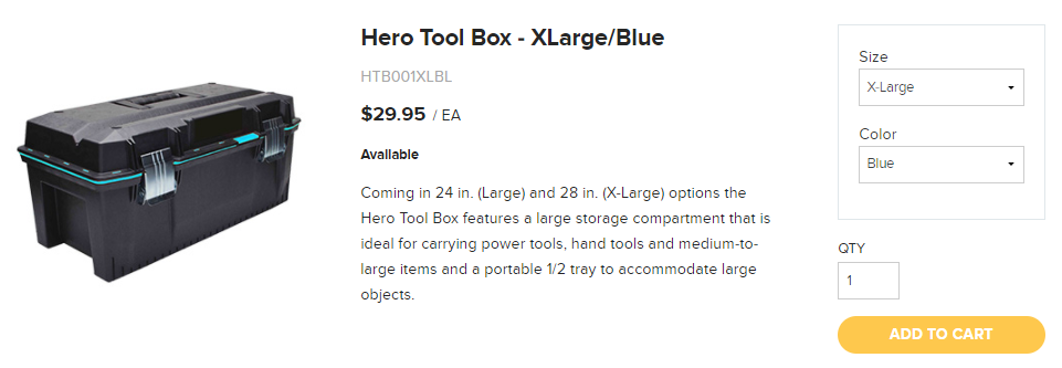 Hero Tools recently started carrying a line of toolboxes. While the toolboxes look similar, and have similar features, they come in three sizes (Small, Large, and X-Large), and each size comes in three colors (Yellow, Red, and Blue). Instead of building a unique product page for each color/size combination, Content Specialist Markus Hayes recommends turning the Hero Toolbox into a Variant Product. This way, when a site visitor browses or searches for the toolbox, they only need to visit one product page; from there, they can select their color/size combination from the drop-downs, and add the item to their cart.