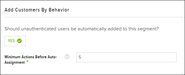 - Under the Customers By Behavior heading, the user can switch the toggle to YES to add unauthenticated users to this segment automatically, and select a Minimum Actions Before Auto-Assignment value (default = 5). When an unauthenticated user filters search results by category, visits a category page, or visits a product detail page, this action counts towards segment assignment. When the minimum is reached, the user is assigned to this customer segment, and can see segment-specific content, product recommendations, and search boosting.