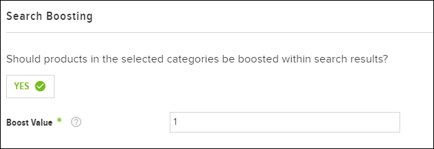 - Under the Search Boosting heading, the user can switch the toggle to YES to boost products in the selected categories in search results, and choose a Boost Value (default = 1). Boost Value is a multiplier that boosts search scores of products in the selected categories. The higher the value, the higher position products in these categories have in search and autocomplete results. This value functions the same as the "Product Search Boost" within the Admin Console > Marketing > Category Boosting.