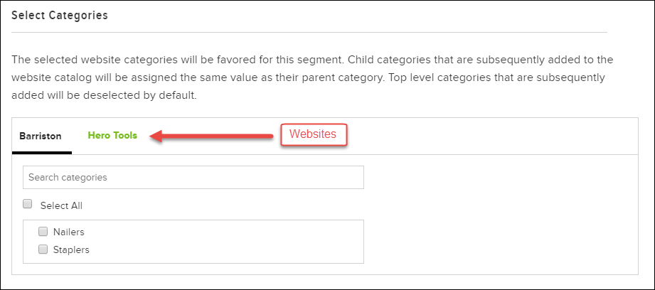 - Under the Select Categories heading, the user can select the website (if more than one exists) and whichever website categories are favored for this customer segment.