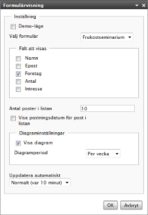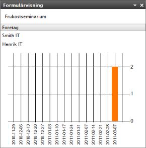 I Formulärvisning visas ett angivet antal av de senaste aktiviteterna, t.ex. de senast avgivna rösterna eller registreringarna via ett formulär. Resultatet av gadgeten Formulärvisning kan också visas grafiskt, vilket ger en snabb och lättolkad översikt över formuläraktiviteterna.