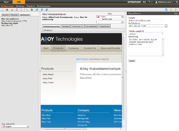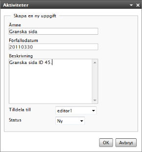 Välj Skapa i redigeraläge i gadgeten Aktiviteter för att skapa en aktivitet i EPiServer CMS. Du växlar då till redigeraläge i EPiServer CMS och ett Åtgärdsfönster öppnas till höger, där du kan välja en sida och skapa en aktivitet. Ange önskad aktivitetsinformation och klicka på Spara.