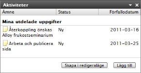 Med gadgeten Aktiviteter får du snabb åtkomst till EPiServer CMS-aktiviteter. Du kan visa aktiviteternas status och skapa nya aktiviteter.